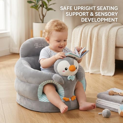 Give your baby a comfortable and supportive spot to practice a new skill with our Baby Sit Up Chair. Designed with your little one’s comfort and development in mind, this chair provides just the right amount of support. Crafted from soft, breathable plush fabric in a lovely grey penguin pattern, the seat is filled with gentle PP cotton, creating a cozy nest. The ergonomic back provides firm support to help infants sit upright, promoting healthy posture as they build important back and core muscles. It’s a perfect companion for playtime, reading, or simply observing the world from a new perspective. We understand life with a baby is busy. That’s why this infant sit up chair is lightweight and portable. Easily move it from the nursery to the living room or pack it for a weekend at grandma’s house. The versatile design makes it a practical addition to your daily routine, providing a familiar and secure spot for your baby wherever you go.