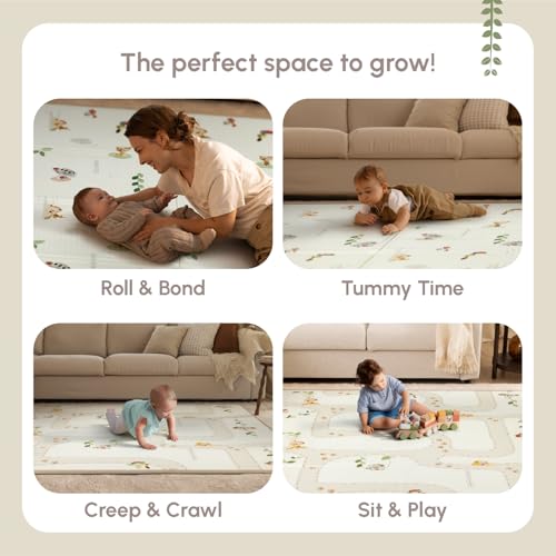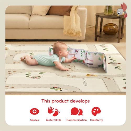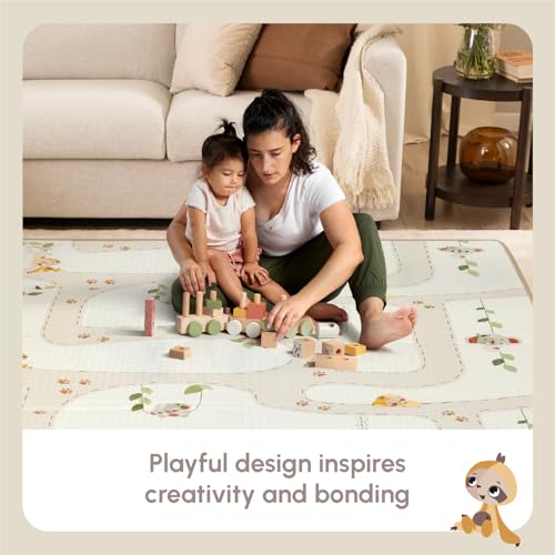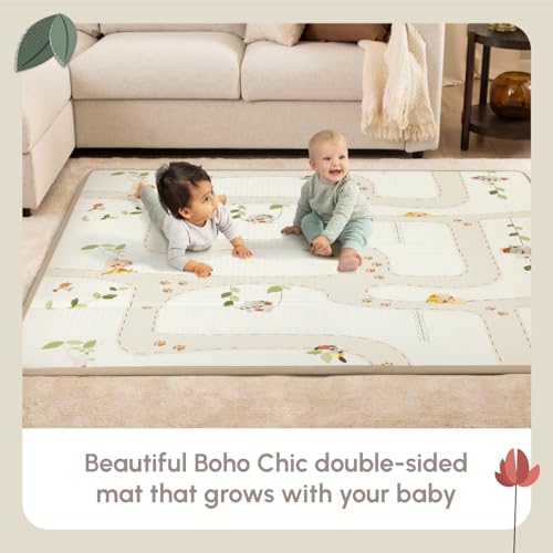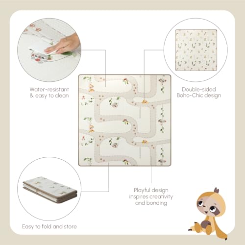 - DOUBLE SIDED BABY FLOOR MAT: one side has a stylish boho-chic design, while the reverse features fun winding paths and tiny friends that invite little ones to create their own adventures, encouraging motor skills, creativity, and joint playtime