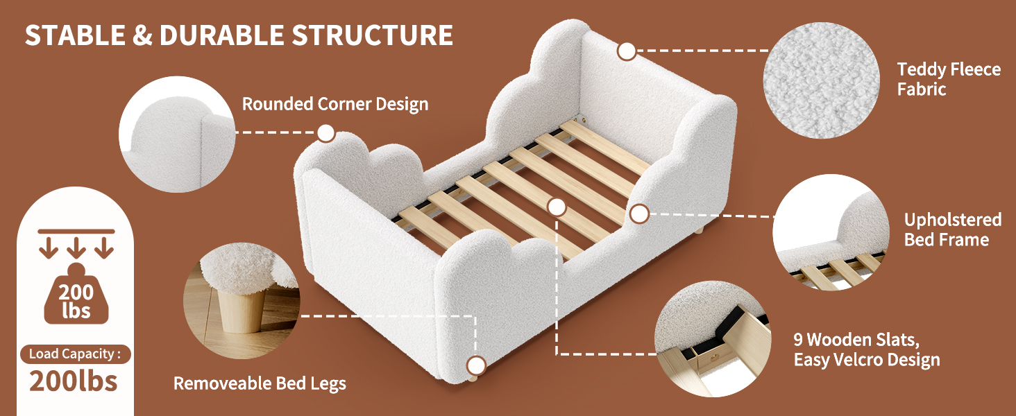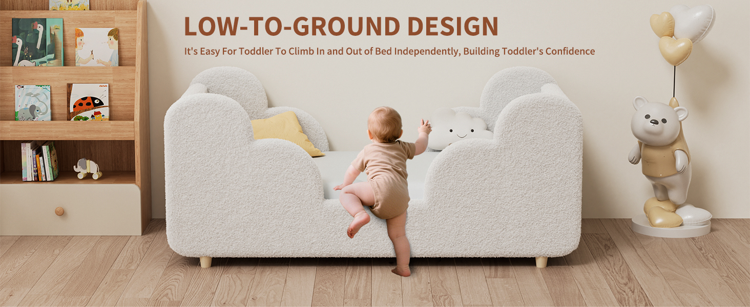 - Cloud-Shaped Safety Guardrail For Peace Of Mind: Designed with adorable cloud-shaped safety guardrails on both sides, this toddler bed features smooth rounded edges throughout the frame to effectively prevent your child from rolling off during sleep. The soft, curved cloud design adds a playful touch to any nursery while ensuring maximum protection. As your child grows more confident, the guardrail can be adjusted or removed to suit different stages of development