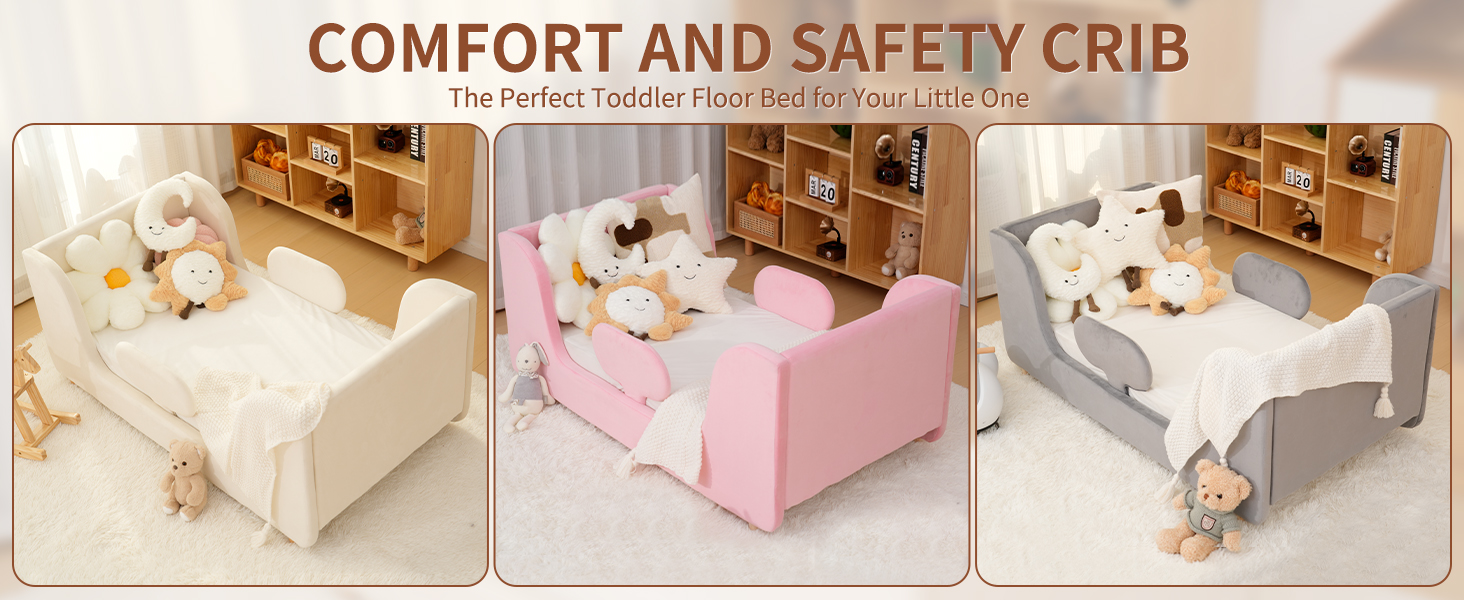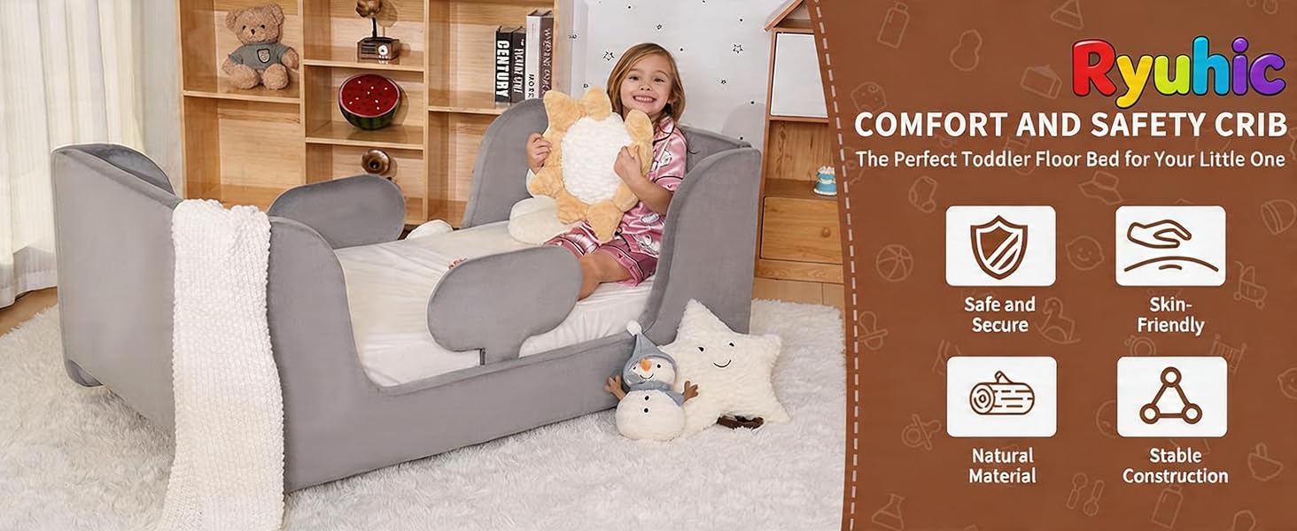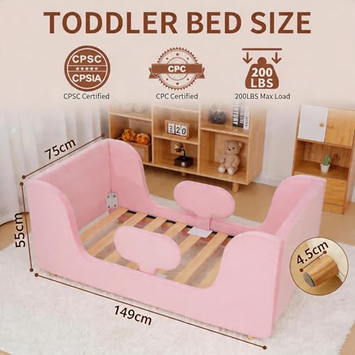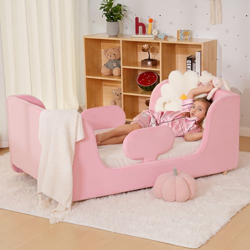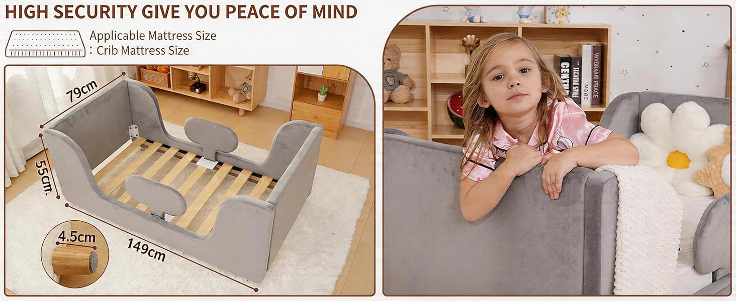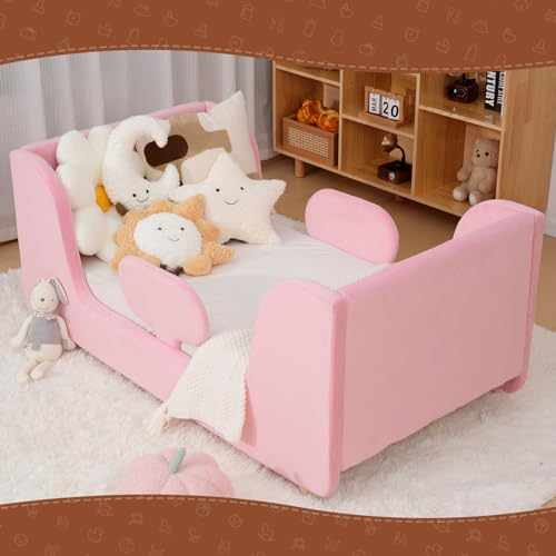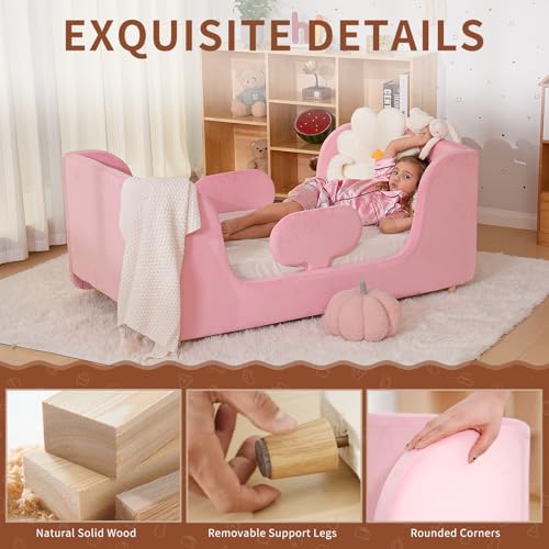 Toddler Bed, Whole Soft Padded Kids Beds with Extra Safety Guardrail, Low Frame
