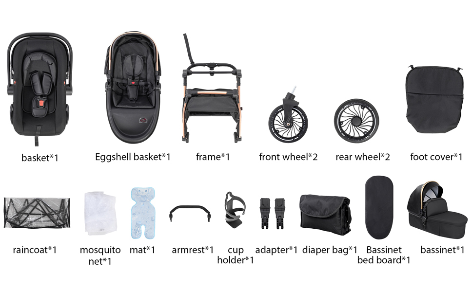 - Growth-oriented Baby Stroller: includes a car seat (0–18 months), a bassinet (0–18 months), and a pushchair seat (6–36 months). The bassinet can be reversed in two directions, and the stroller seat backrest can be adjusted to 3 positions, meeting your baby's growth needs at different stages