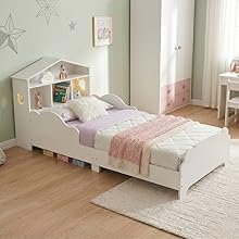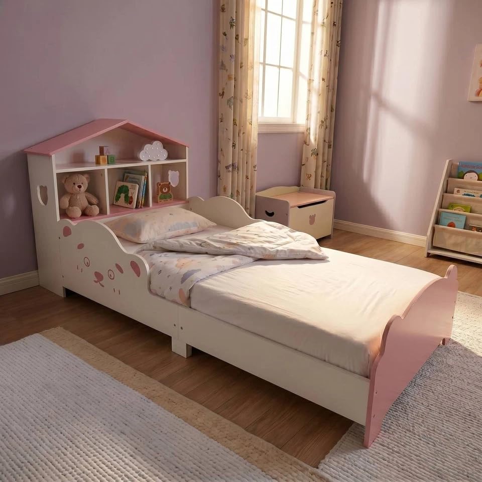 The URBNLIVING Wooden Toddler Bed blends modern design with practical functionality, making the transition from cot effortless. Featuring a house-shaped headboard with built-in storage, it keeps books, toys, and bedtime essentials neatly organised. Crafted from sturdy wood with a low, child-safe profile, it offers both comfort and peace of mind while adding a charming touch to any nursery or playroom.