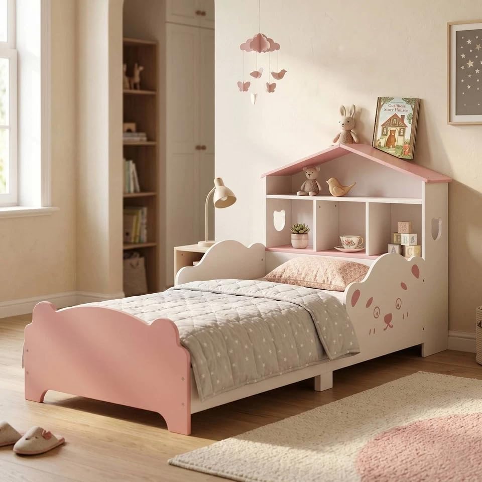 URBNLIVING Wooden Toddler Bed with Integrated Bookshelf Storage – Junior Kids Bed Frame with Built-in Bookcase for Bedroom Organisation (PINK)