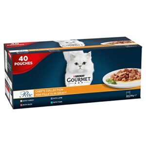 Gourmet Perle Chefs Collection Wet Cat Food 40 x 85g Gourmet Perle Chef's Collection multipack contains delicious recipes in Gravy with Turkey, Tuna, Duck and Lamb Complete pet food for adult cats, 100% complete and balanced nutritional pet food for adult cats (aged 1 to 7) A tempting variety of flavours to tempt your cat's taste buds Served in 85g...