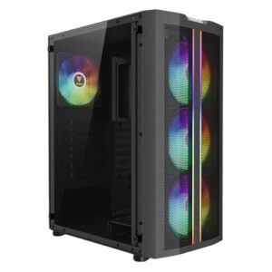 GAMDIAS AURA GC3 Elite High Airflow Tempered Glass Mid-Tower ATX Case – Four Included 120 mm RGB Fans – Fits 6X 120mm Fans – Tool-Free Installation Side Window – Two Sleek RGB Light Strips – Black Distinctive Mesh RGB Mid-tower Case: The AURA GC3 ELITE is a budget-oriented mid-tower case with a distinctive front mesh panel design. Featuring two sleek...