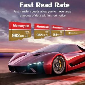 Moloplpou Memory Card 982GB with Adapter, Full HD Flash Memory Card,Fast Speed Mini TF Storage Card, Compatible with Tablet/Drone/Camera/Smartphone, Black Red, 1-Pack (TF Card + Adapter) WIDELY APPLICABLE: The flash memory card demonstrates extremely high device compatibility, whether it is a smartphone, DSLR camera, or full HD camera, it can be perfectly adapted. It is not only a storage tool...