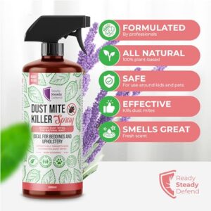 Dust Mite Killer & Repellent Spray | Ideal for Beddings and Upholstery | All Natural Ingredients | 200ml Effective Mite Elimination Harness the natural efficacy of Ready Steady Defend Dust Mite Killer Spray, expertly formulated to target and eliminate dust mites swiftly. Its unique blend of essential oils not only eradicates mites but deters their return, ensuring a mite-free environment....