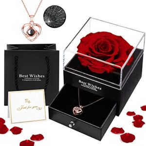 Preserved Real Rose, Gift Box with I Love You Necklace, Handmade Eternal Real Rose Flower Gifts for Her Woman Wife Girlfriend Mother on Birthday, Anniversary, Valentine's Day, Mother's Day, Christmas 【100% Handmade Preserved Real Rose】Each rose is made of real rose and processed by special technology.If properly maintained, it can maintain its vividness and beauty for at least one year...