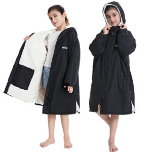 Hiturbo Kids Waterproof Changing Robe-Windproof Warm Robe Oversized Coat Surf Poncho with Fleece Lining Black 【WATERPROOF & WINDPROOF】 This kids swim parka is made of waterproof PET fabric, which can reach 100.00% waterproof. Cuffs can be pasted, you can adjust the tightness according to your needs, then prevent wind and rain from entering. 【ONE SIZE & UNISEX】 The swim coat...